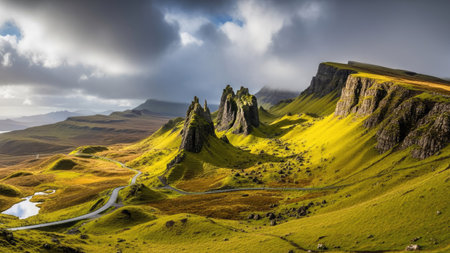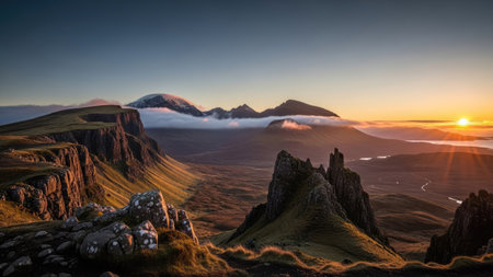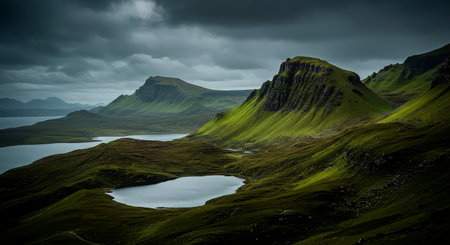 From a mesmerizing viewpoint in the Quiraing, Scotland, a sweeping vista unfolds. Jagged cliffs, verdant slopes, and vast valleys create a dramatic tableau. It's a place where nature's grandeur reigns supreme, captivating the senses and offering an unforgettable panorama of the rugged beauty of the Scottish Highlands.