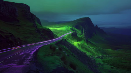 A sunset paints the sky with vibrant hues of orange, pink, and purple, casting long shadows across a rugged mountain landscape. Jagged rock formations rise dramatically from the verdant green slopes, sculpted by time and the A winding path suggests a journey through this wild and remote terrain. The scene evokes a sense of awe and tranquility, capturing the raw beauty of nature at dusk.