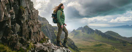 A dramatic mountain ridge under a stormy sky, with dark clouds rolling in, a lone hiker standing against the wind, and the distant sound of thunder. The raw and powerful setting feels invigorating.