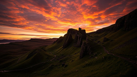 A sunset paints the sky in vibrant hues of orange and red, casting a dramatic glow over a rugged mountain landscape. Jagged rock formations rise from the undulating green hills, sculpted by time and erosion. A winding path suggests a journey through this wild and remote terrain. The scene evokes a sense of awe and the raw beauty of nature.