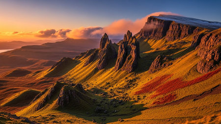 The captures a mountain landscape in the Scottish Highlands during the golden hour. Sharp, jagged rock formations rise dramatically from rolling hills bathed in warm, golden light. The setting sun casts long shadows, highlighting the textures of the rugged terrain. Patches of red vegetation add a vibrant contrast to the dominant yellow and green hues of the grass. Wispy clouds in the sky are illuminated by the warm light, creating a serene and atmosphere.