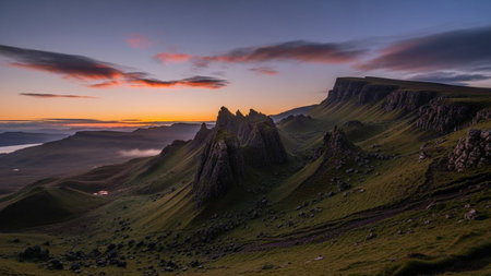 A sunset paints the sky in vibrant hues of orange, purple, and pink over the rugged Scottish Highlands. Jagged rock formations pierce the landscape, catching the last rays of golden light. Rolling green hills and moss-covered slopes are cast in dramatic shadows, creating a sense of depth and majesty. The scene evokes a feeling of serene tranquility and the raw beauty of the wilderness.