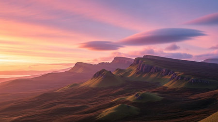 A panoramic view of the Scottish Highlands at sunset. The sky is painted with hues of pink, purple, and orange, with dramatic clouds casting shadows across the rolling hills. In the foreground, the iconic Old Man of Storr rock formation stands tall, a testament to geological forces. The landscape is a tapestry of green and brown, with a winding path leading through the undulating terrain towards a distant body of water. The warm light of the setting sun illuminates the scene, creating a...