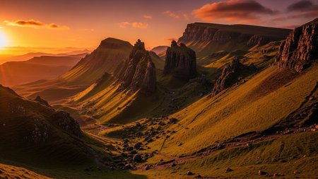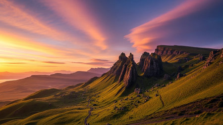 A sunset paints the sky with vibrant hues of orange and purple over the rugged, green-sloped mountains of the Scottish Highlands. Jagged rock formations rise majestically from the landscape, catching the last golden rays of the sun. A winding dirt path meanders through the grassy terrain, inviting exploration. The scene is bathed in the warm glow of the setting sun, creating a dramatic and atmospheric vista.