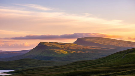 A panoramic view of rolling green hills illuminated by the warm, golden light of a sunset. Soft pastel-colored clouds drift across the sky, casting gentle shadows on the undulating landscape. The scene evokes a sense of peace and vast natural beauty, with the gentle curves of the hills leading the eye towards the horizon. captures the serene and tranquil atmosphere of a remote wilderness at dusk.