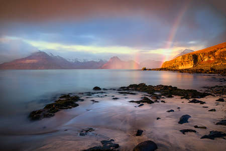 Rocks near Elgol, Loch Scavaig, Isle of Skye Scotland. Warm sunset colors in cold February evening. Popular photographers destination.