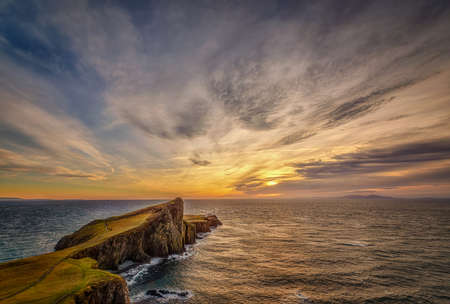 Neist Point peninsula with lighthouse is a very photographed place and tourist attraction on Isle of Skye, Scotland. All travelers must see