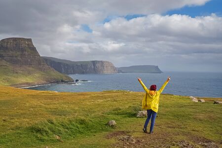 Woman traveller standing with her hends raised on the beautiful scenic coast