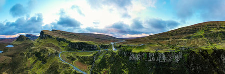 Aerial drone shot of Quiraing - Isle of Skye, Scotland. Sunrise, Fall 2021