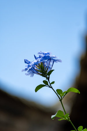 telephoto shot of blue plumbago flowers and plant outdoor with clouds in the background shot at shallow depth of field