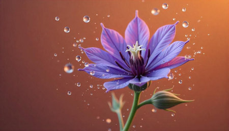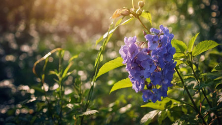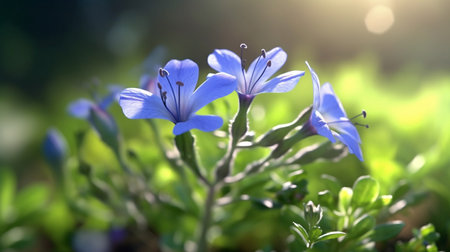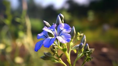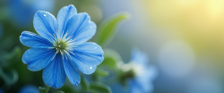 A stunning blue flower, adorned with droplets of dew, stands out against a softly blurred background illuminated by warm sunlight. This enchanting image captures the essence of natures beauty, evoking feelings of tranquility and renewal.