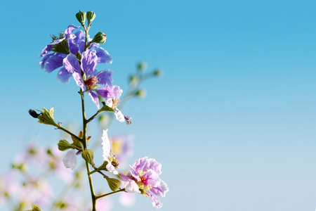 Violet flowers on a background of blue sky. Bright summer cute image for banner, postcard. View from below.