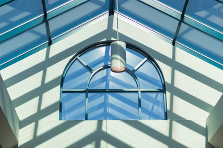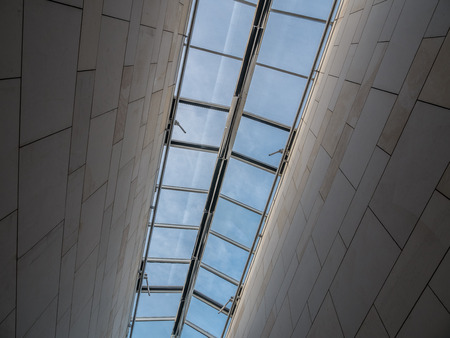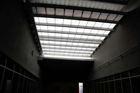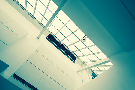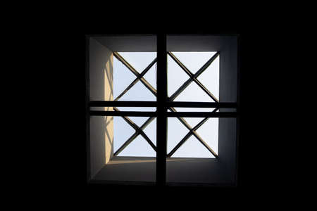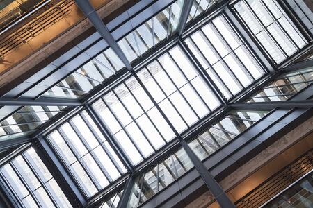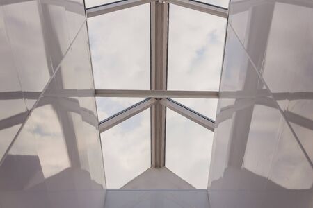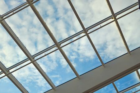 Skylight or glass sunroof ceiling of a building. Window in commercial office or industrial building. Modern design architecture, or energy conservation model using nature sunlight concept.