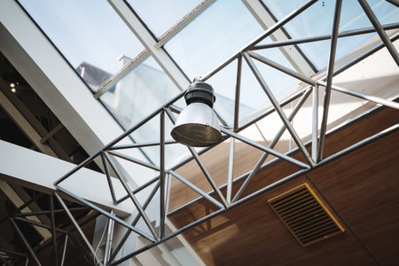 Transparent ceiling in business center. Glass triangle windows. Mesh structure architecture. Abstract geometric pattern of framed glass