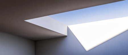 Bright natural light floods an interior room through a triangular skylight. The sharp angles of the ceiling create a striking contrast with the soft hues of the walls enhancing the modern aesthetic.