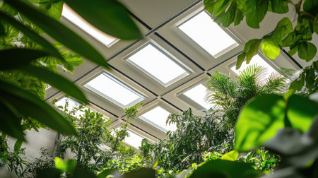 Modern ceiling windows above an indoor plant garden, enhancing the biophilic design