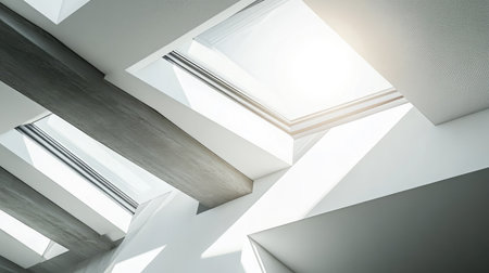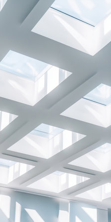 Modern architectural design featuring geometric ceiling skylights with soft natural sunlight illuminating the interior space.
