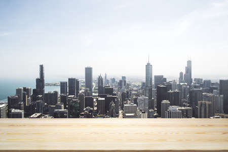 Empty wooden table top with beautiful Chicago skyscrapers at daytime on background, mock up