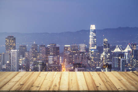 Table top made of wooden dies with San Francisco city view at dusk on background, template