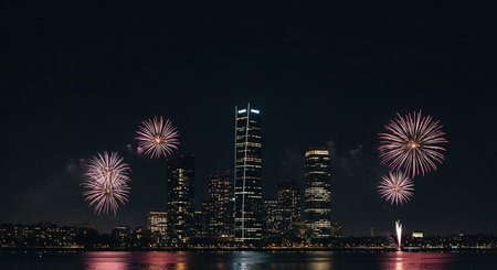 Vibrant fireworks illuminating city skyline at dusk
