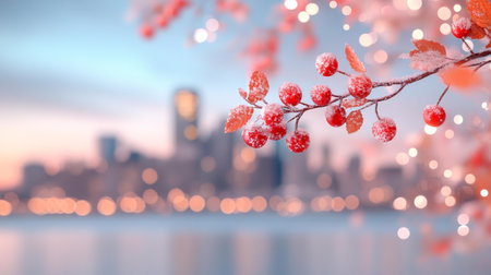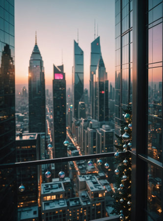 A stunning nighttime cityscape showcases illuminated skyscrapers and glimmering reflections in glass buildings. This vibrant winter scene captures urban beauty and energy.