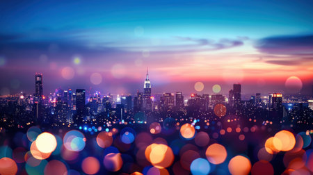 A vibrant city skyline is visible at dusk, showcasing tall buildings with twinkling lights. Colorful bokeh lights add a dreamy effect, enhancing the urban atmosphere.