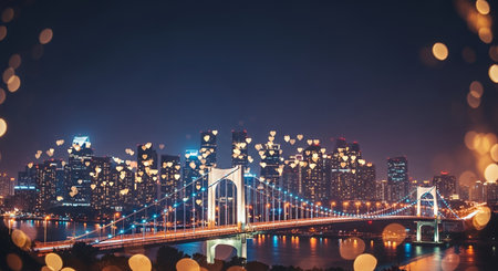 A captivating view of a city skyline at dusk, showcasing light trails symbolizing connectivity over a modern bridge.