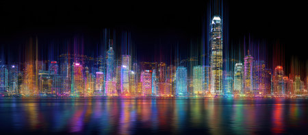 A vibrant cityscape is depicted at night with a multitude of colorful lights illuminating buildings. The image showcases a surreal artistic style with vertical light streaks and water reflections. It's suitable for various commercial uses, including website backgrounds and illustrations. The overall aesthetic suggests a modern and dynamic setting.