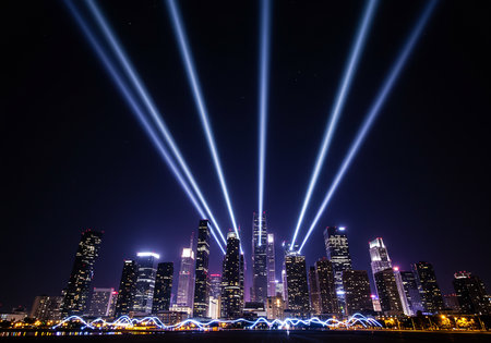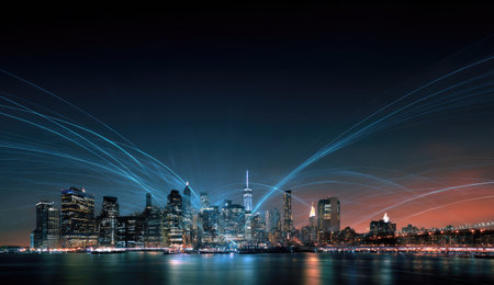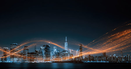 A nighttime cityscape displays numerous illuminated buildings along a waterfront. Lines of light arc across the sky, connecting various points. The composition utilizes a dark color palette with contrasting bright elements, creating a dynamic visual. This image could be suitable for digital design projects or as a backdrop for various commercial applications.