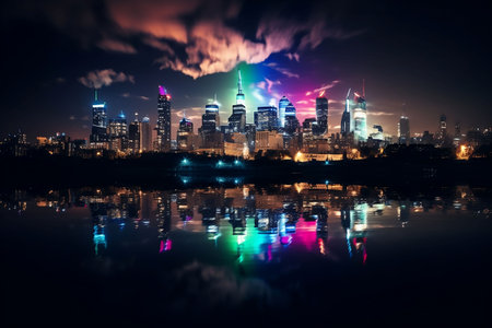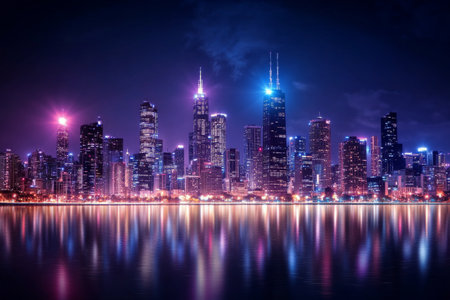 Vibrant city skyline illuminated at night with reflections on calm waters