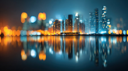 Stunning Nightview of Illuminated Urban Skyline with Skyscrapers Reflecting on Calm Water Surface in Vibrant City Life Atmosphere