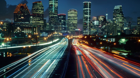 Captivating night cityscape showcasing illuminated highways and skyscrapers. The vibrant light trails create dynamic energy and movement.