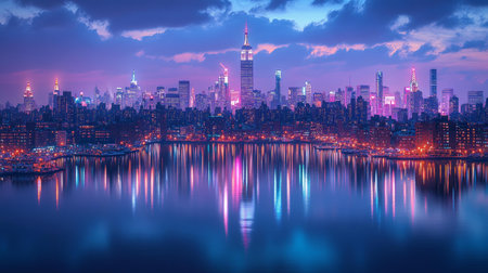 An AI generated illustration of A stunning cityscape featuring a vibrant city skyline of illuminated buildings, reflecting on a serene body of water