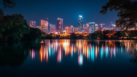 Stunning nighttime view of a vibrant city skyline reflecting on a tranquil river in the heart of downtown