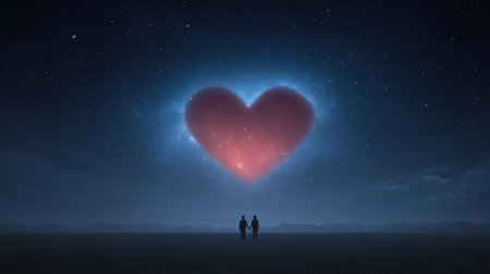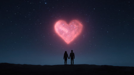 A touching scene featuring a couple standing hand in hand under a starry night sky, with a glowing heart shape illuminating the darkness, symbolizing love and connection.