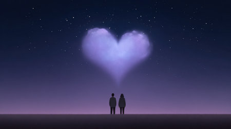 A serene illustration depicting a couple silhouetted against a starry night sky, with a heart-shaped cloud conveying deep emotions and romance.