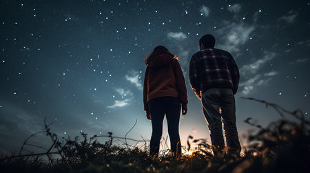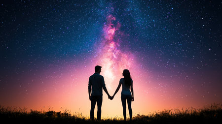 A romantic scene depicting a couple holding hands under a heart-shaped constellation in the night sky. This image captures feelings of love, connection, and intimacy in a serene outdoor setting.