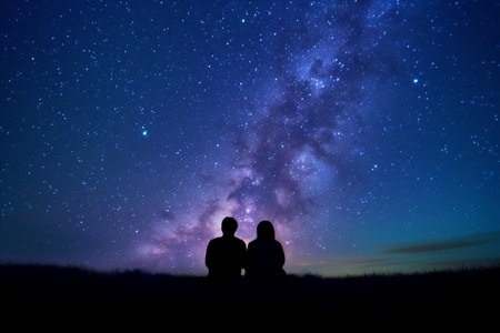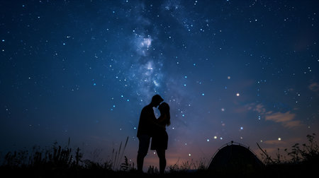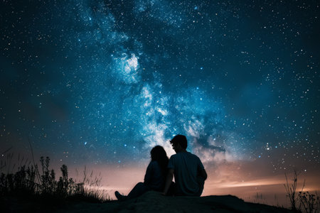 AI-generated Silhouette of a couple sitting under a starry sky with the Milky Way visible, creating a romantic and serene atmosphere.