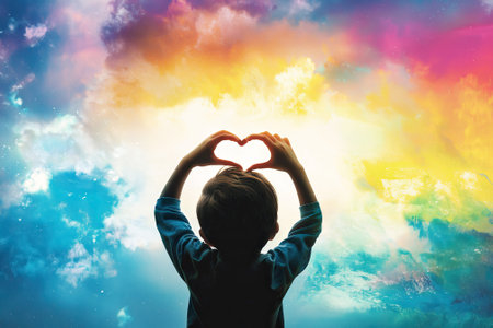 A person with their back to the viewer, arms raised, seemingly interacting with a vibrant, glowing heart shape against a cosmic background.
