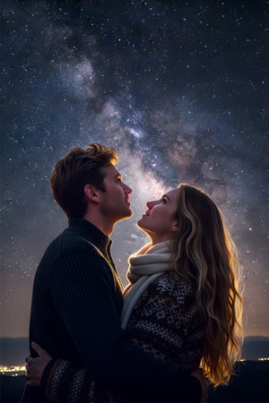 A loving couple embracing looks up in awe at the stunning Milky Way galaxy stretching across the dark night sky, symbolizing dreams and connection.