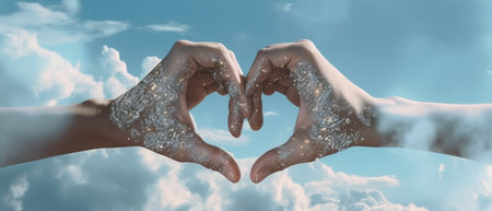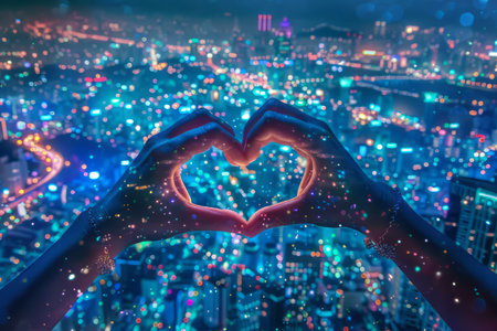 Two hands forming a heart shape against a backdrop of twinkling city lights. High quality illustration
