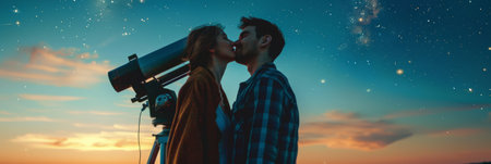 a couple stargazing with a telescope on a clear night, with a star-filled sky and engaged expressions, promoting romantic and educational activities.