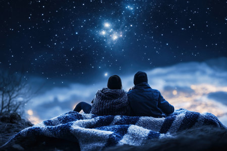 A couple sits closely together, wrapped in warm blankets, gazing at the breathtaking Milky Way. The night sky is filled with countless stars, creating a romantic atmosphere.