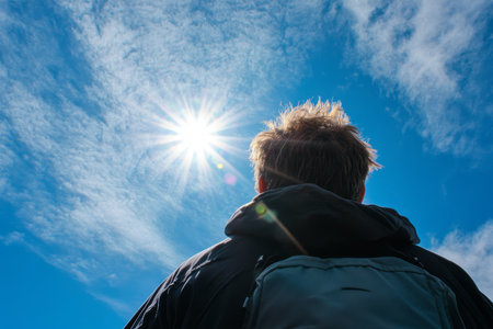 A person stands silhouetted against a vividly bright blue sky, fully basking in the warm sunlight and relishing the beautiful outdoors on this wonderfully lovely sunny day that invites adventure