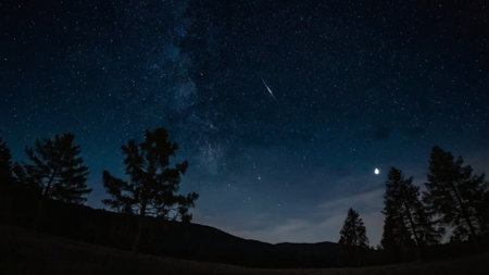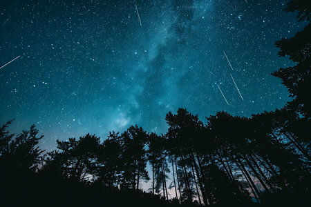 A breathtaking night sky filled with shooting stars and a milky way galaxy shining brightly over a silhouetted forest of tall trees. Captured during a clear night, this serene scene evokes a sense of wonder and tranquility.