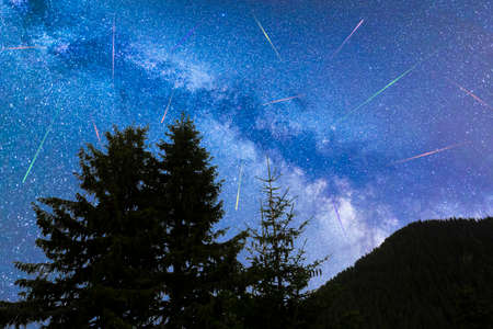 A view of the stars of the blue Milky Way with pine trees forest silhouette in the foreground. Night sky nature summer landscape. Perseid Meteor Shower observation. Colorful shooting stars.