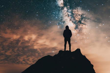 Landscape with Milky Way. Night sky with stars and silhouette of a standing happy man on the mountain, Success or winner, leader concept. High iso with Noise.