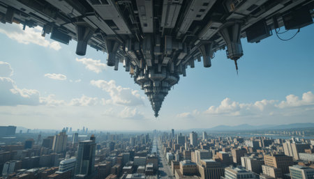 The world where abstract architecture and nature concepts becomes reality and comes to life in a most unexpected ways. Umbrellas above city. Surreal environmental concept.