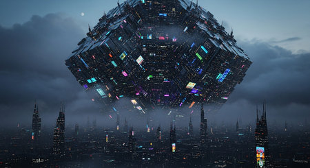 A colossal, intricately detailed cubic megastructure hovers ominously in a cloudy sky above a sprawling futuristic city. The structure is densely packed with illuminated windows and glowing neon lights in various colors, suggesting a vibrant, technologically advanced civilization. Below, a dark cityscape with towering skyscrapers stretches into the distance, shrouded in mist and twilight. The overall atmosphere is one of awe, mystery, and a touch of dystopian grandeur.