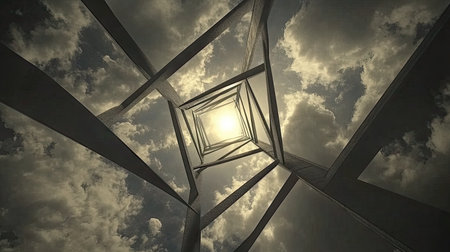 Captivating view of sky through a unique wooden architectural feature. The play of light and clouds creates an enchanting ambiance. Perfect for art and nature themes.